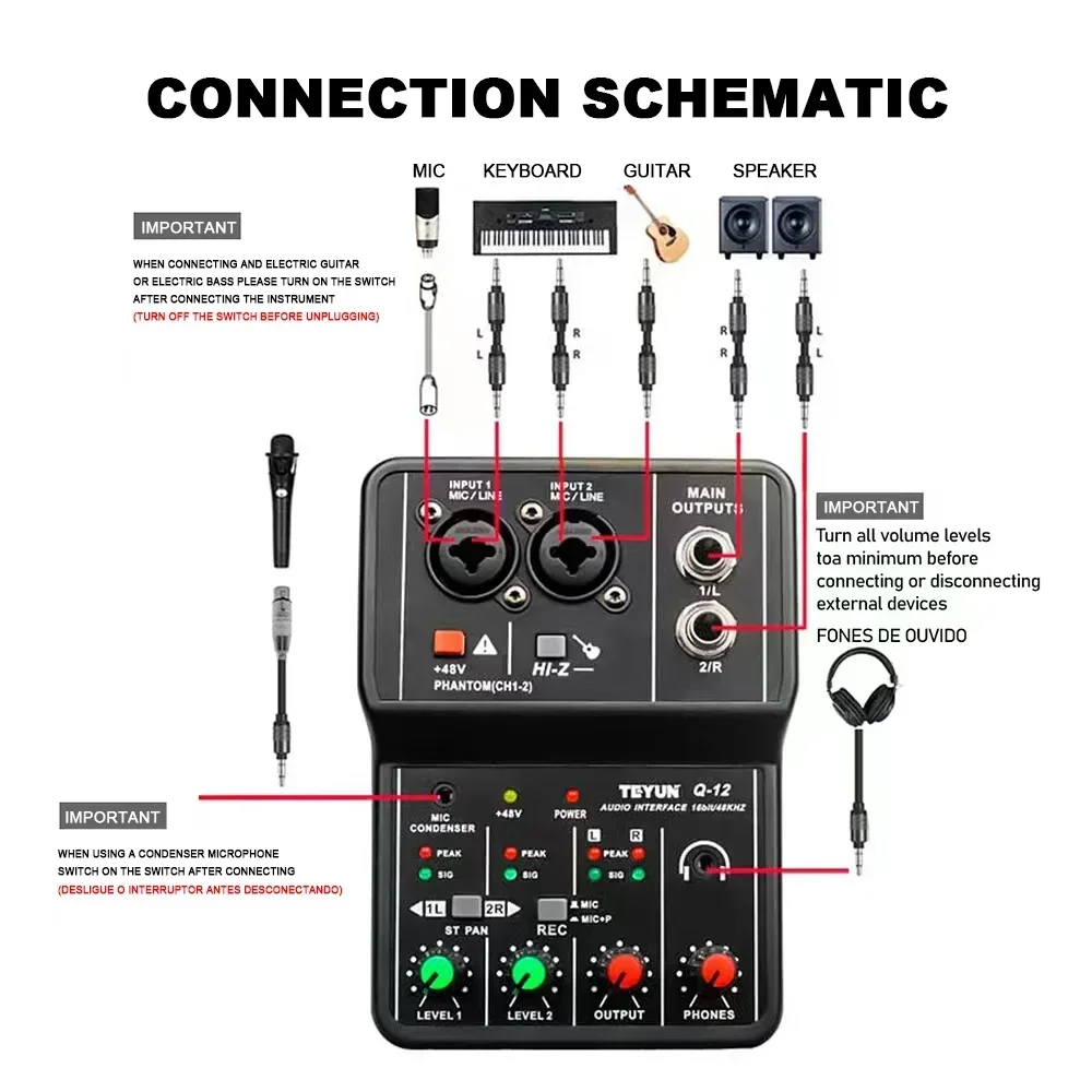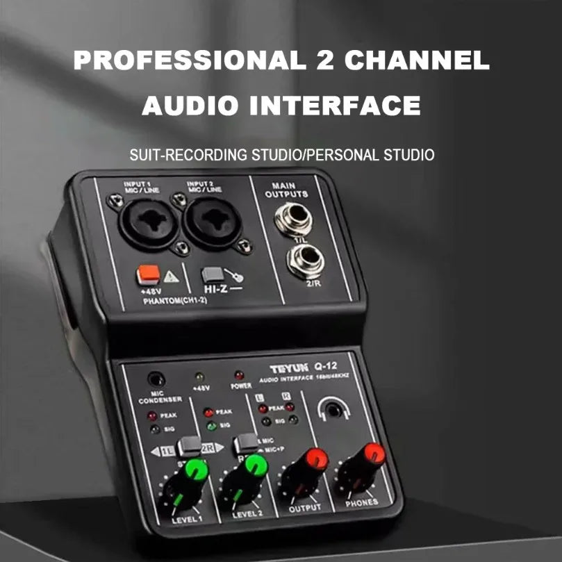 2 Channels Professional Portable Audio Interface Sound Card Console Mini USB MIXER for Guitar Recording Studio Singing Q12