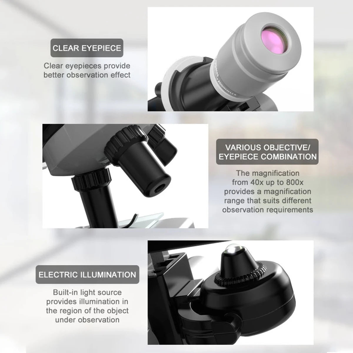 [High Magnification] Children's primary microscope eyepiece with 10x, 20x lens, cooperate 4x 10x 40x objective lenses, biological microscope provides 3 magnification settings, 100X, 400X, 1200X.